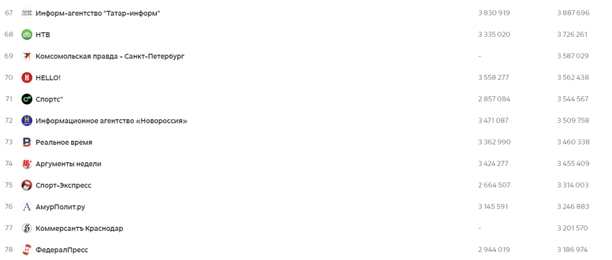 В топ-100, помимо «Татар-информа», из татарстанских СМИ вошло также «Реальное время», занявшее 73-ю строчку с охватом более 3,4 млн.
