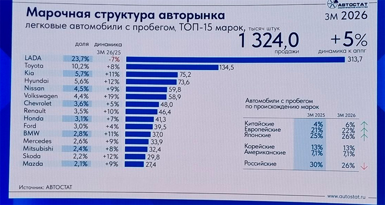 Вторичный рынок по своим объёмам значительно опережает первичные продажи. За три месяца продано 1,324 млн автомобилей с пробегом — плюс 5% к прошлому году. Марочная структура здесь традиционная: Lada — 23,7% (доля снижается на 7%), Toyota — 10,2% (+8%), Kia — 5,7% (+11%), Hyundai — 5,6% (+12%), Nissan — 4,5% (+9%), Volkswagen — 4,4% (+19%), Chevrolet — 3,6% (+5%), Renault — 3,5% (+10%).