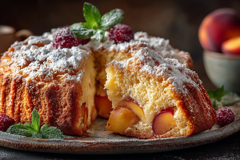 Духовку разогреваю до 180°C. Форму диаметром 22 см смазываю растительным маслом, дно застилаю пергаментом, а стенки присыпаю тонким слоем муки. В глубокой миске миксером на высокой скорости взбиваю 5 яиц со 150 г сахара в очень пышную, светлую, почти белую массу — это займёт около 5-7 минут. 240 г муки смешиваю с 1,5 чайными ложками разрыхлителя и просеиваю через сито. Аккуратно, порциями, лопаткой вмешиваю мучную смесь в яичную массу движениями снизу вверх, стараясь сохранить воздушность. 450 г персиков (можно взять консервированные, но свежие лучше) нарезаю небольшими кусочками, удаляя косточки. Выкладываю персики на дно подготовленной формы ровным слоем. Заливаю сверху тестом и аккуратно разравниваю лопаткой. Выпекаю в разогретой духовке около 35-40 минут до глубокого золотистого цвета. Готовность проверяю деревянной зубочисткой — она должна выходить сухой. Даю пирогу немного остыть в форме, затем переворачиваю на блюдо, снимаю пергамент и подаю.