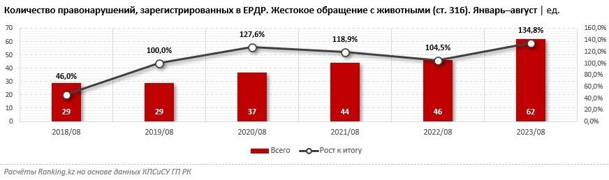 По итогам восьми месяцев текущего года установленная сумма материального ущерба, причиненного правонарушениями, связанными с жестоким обращением с животными, составила 110 тысяч тенге против 50 тысяч тенге годом ранее. Годовой рост — в 2,2 раза.