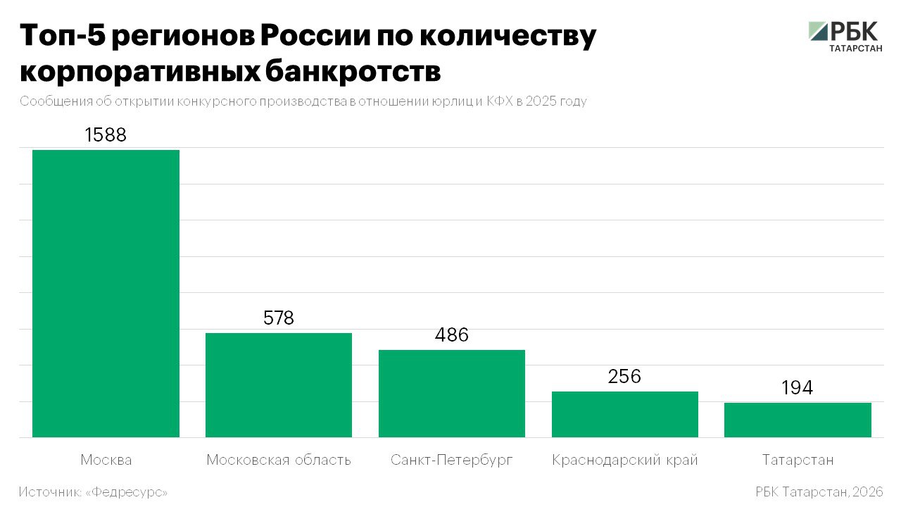 По данным «Федресурса», лидером по количеству банкротств компаний и КФХ по итогам прошлого года стала Москва – порядка 1,6 тыс., что в восемь раз больше, чем в Татарстане. Больше, чем в республике, их зарегистрировали также в Московской области (578), Санкт-Петербурге (486) и Краснодарском крае (256).