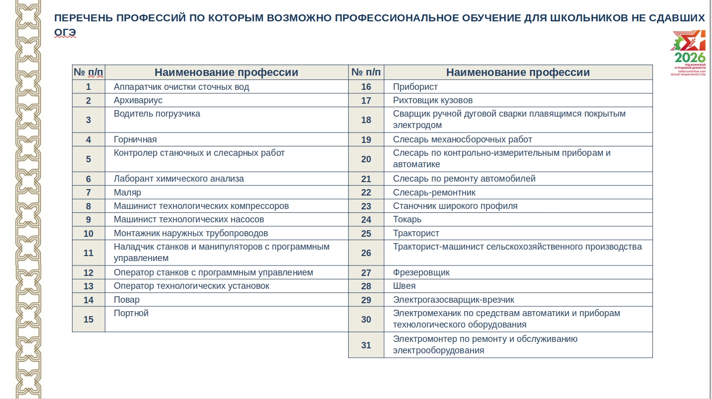 После внесений поправок в закон об образовании утверждено более 30 профессий, обучение на которые доступно даже без сдачи ОГЭ. Кроме того, любой ребёнок во время обучения в школе может пройти подготовку на целый ряд специальностей.
