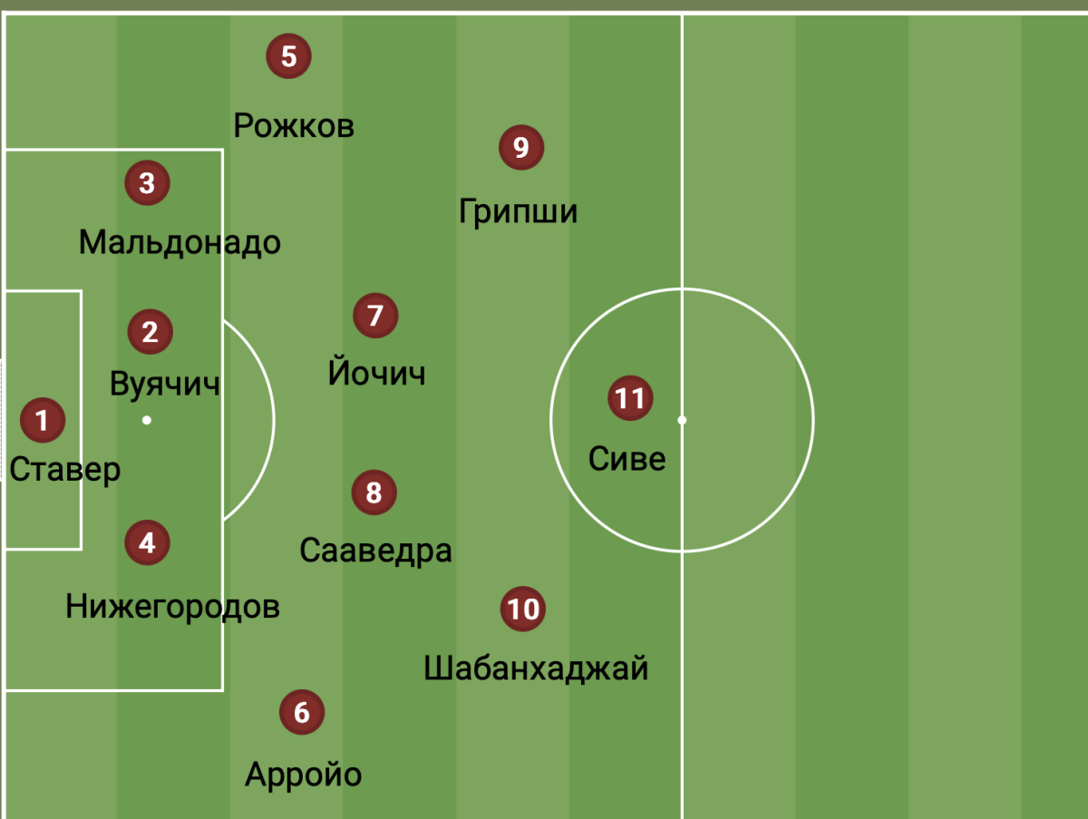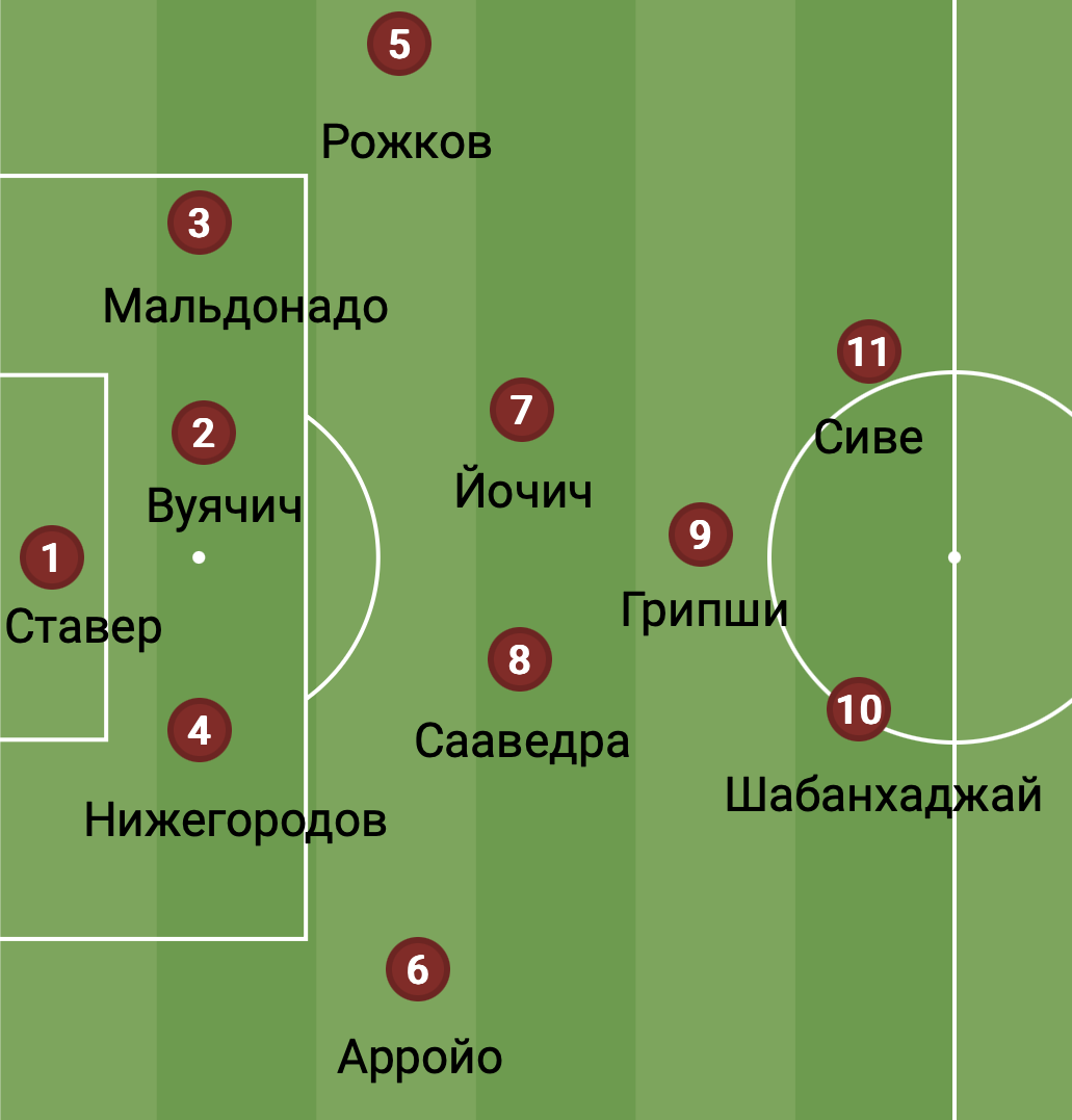 То есть Артига может использовать Назми Грипши или на позиции «десятки», или на позиции левого инсайда. Во втором случае на другом краю, справа, окажется соответственно Дардан Шабанхаджай. Если всё-таки в «Рубине» появится чистый плеймейкер, то схема претерпит изменения и преобразится в 2-1-2, где нападающих сыграют Сиве и Шабанхаджай, пониже встанет Грипши, а в центре поля расположатся Начо и Йочич.