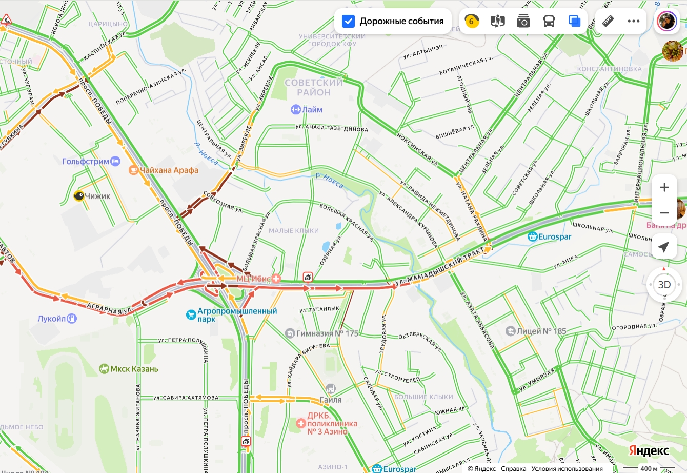 Движение затруднено также по улицам Космонавтов и Аграрной, а также на Мамадышском тракте. Затор наблюдается от Советской площади до парка «Светлая долина».