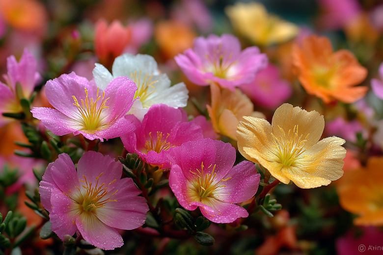 Невысокие, стелющиеся по земле кустики (высотой всего 15-20 см) разрастаются в ширину до полуметра, образуя сплошной, бархатистый ковер самых разных оттенков. Цветение портулака — это настоящий фейерверк красок, который длится все лето, с июня до самых заморозков. Бутоны раскрываются даже в пасмурную погоду, радуя глаз яркими мазками малинового, желтого, оранжевого, белого и розового цветов. В дождливую погоду цветки могут закрываться, но стоит выглянуть солнцу, как они вновь открываются навстречу теплу.