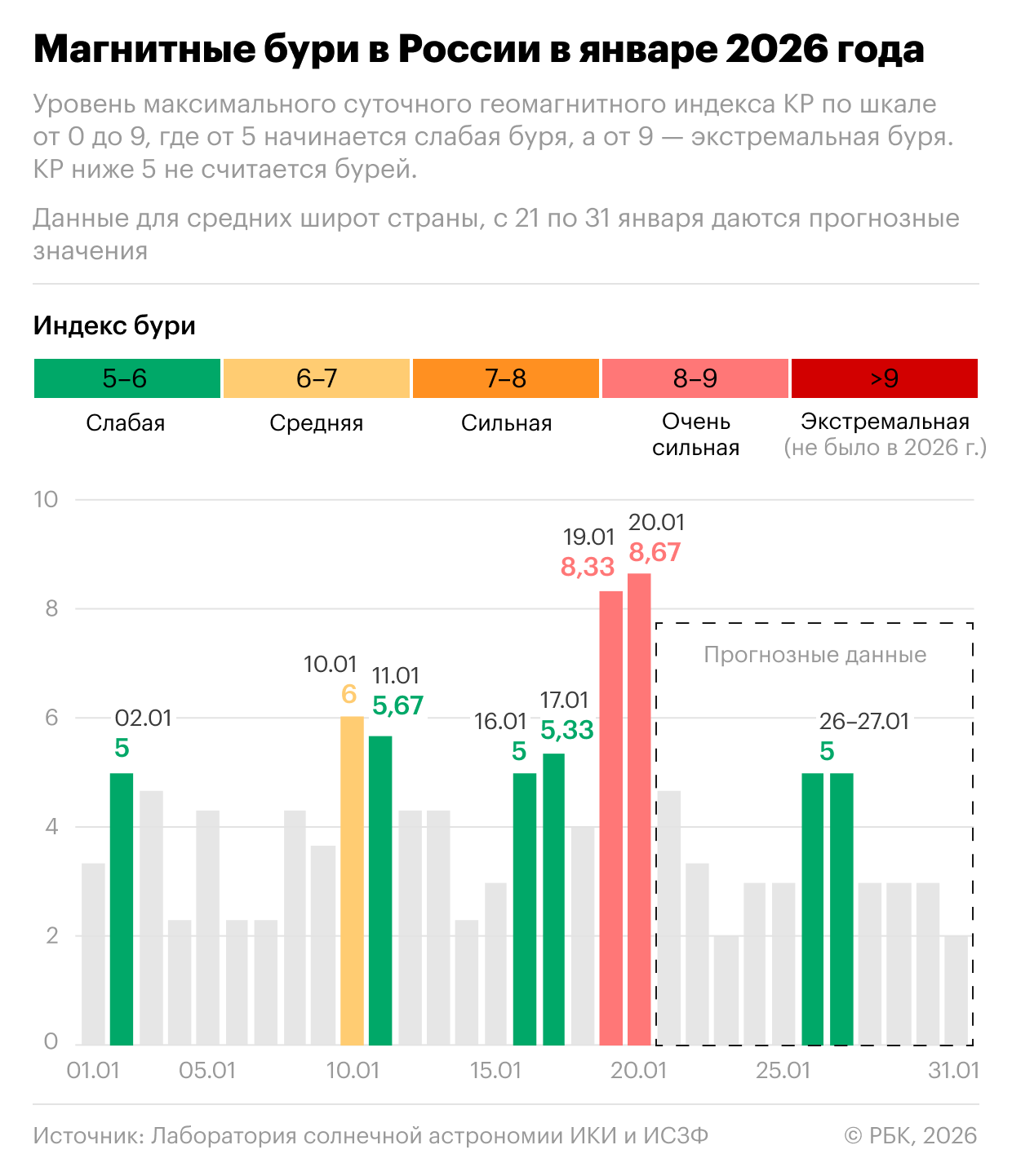 Радиационный шторм вызвал мощную магнитную бурю четвертого уровня (всего уровней пять, где G4 — очень сильная буря, а G5 — экстремальная). Пикового значения — 8,67 Kp (геомагнитный индекс) — буря достигла между полуночью и тремя часами ночи по московскому времени. На момент публикации это самая сильная буря в январе 2026 года.