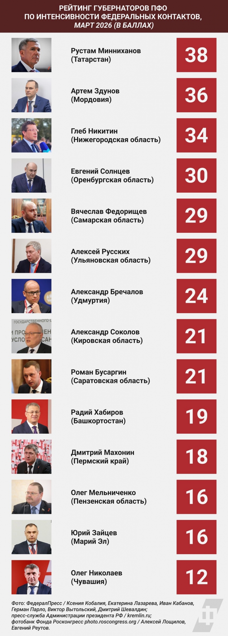 Первый месяц весны в политической жизни Приволжья ознаменовался тремя встречами Владимира Путина с губернаторами регионов округа. Также ключевыми событиями марта, безусловно, стали форум партии власти и заседание Совета под руководством полпреда Игоря Комарова, которые прошли в Нижнем Новгороде. Все это повлияло на расклад в рейтинге приволжских губернаторов «ФедералПресс» по интенсивности федеральных контактов в марте.