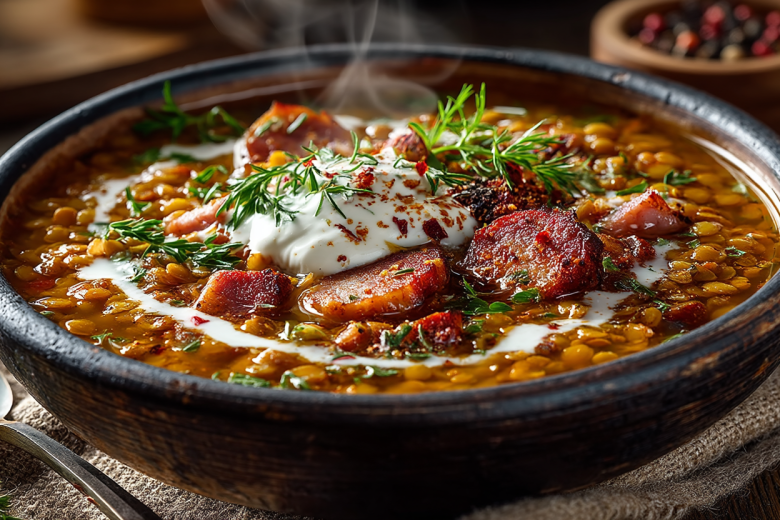 Этот суп — квинтэссенция сытости и домашнего уюта. Долгое томление раскрывает всю глубину вкуса чечевицы и копченостей, создавая невероятно густую и ароматную основу.